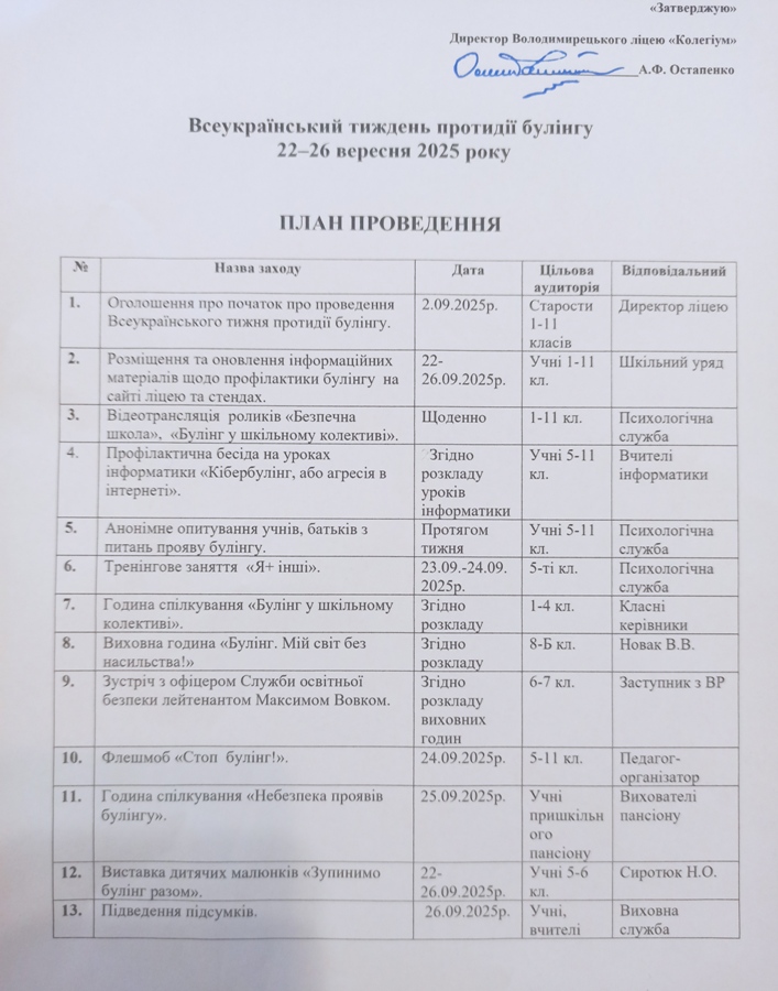 План заходів, спрямованих на запобігання та протидію булінгу (цькуванню) в закладі освіти