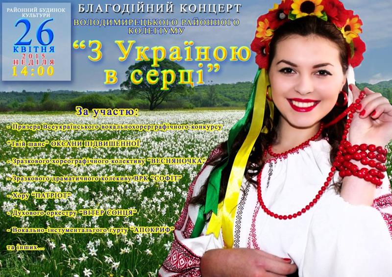 О 14 годині 26 квітня 2015 року, в приміщенні РБК відбудеться благодійний концерт «З Україною в серці», у підтримку бійців АТО, випускників та працівників колегіуму. Патріотичний дух Володимирчан підтримуватимуть мистецькі колективи закладу.
