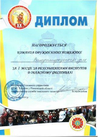 З 16 по 18 травня 2014року в. Олександрії біля м. Рівного відбувся ХХ фестиваль дружин юних пожежних. Команда колегіуму "Рятівник", яка виступала за Володимирецький район, зайняла І почесне місце. Керівник команди - вчитель Захисту Вітчизни Думенко Ярослав Миронович.