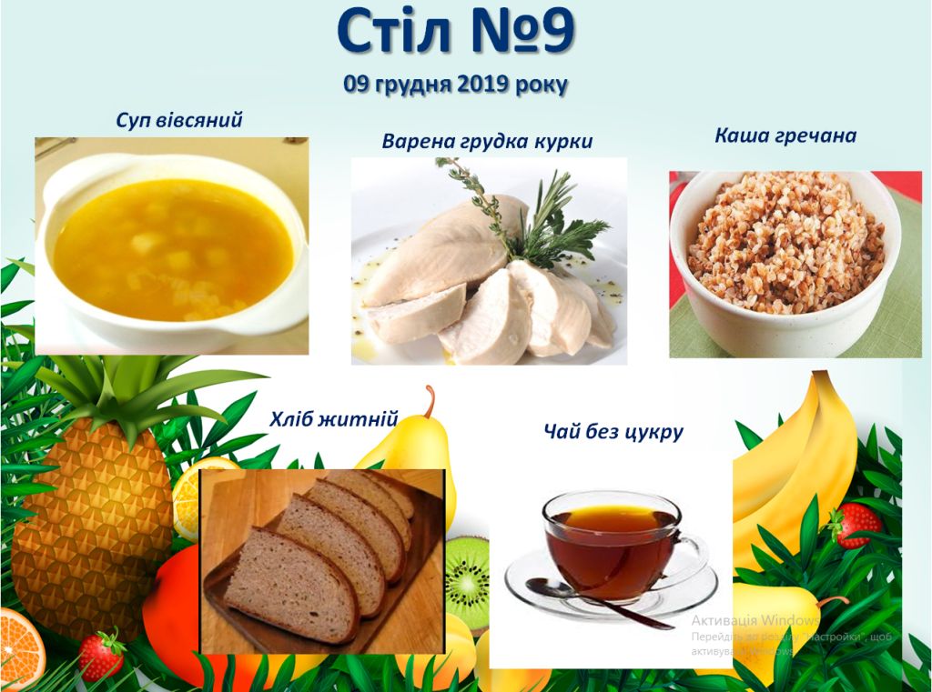 Дієтичне меню Стіл №5 і Стіл №9 на 09 грудня 2019 року
