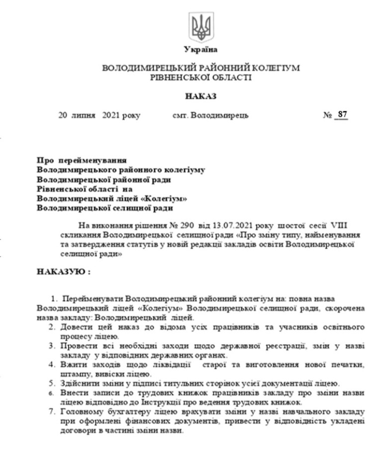 Наказ "Про перейменування Володимирецького районного колегіуму Володимирецької районної ради Рівненської області на Володимирецький ліцей "Колегіум" Володимирецької селищної ради