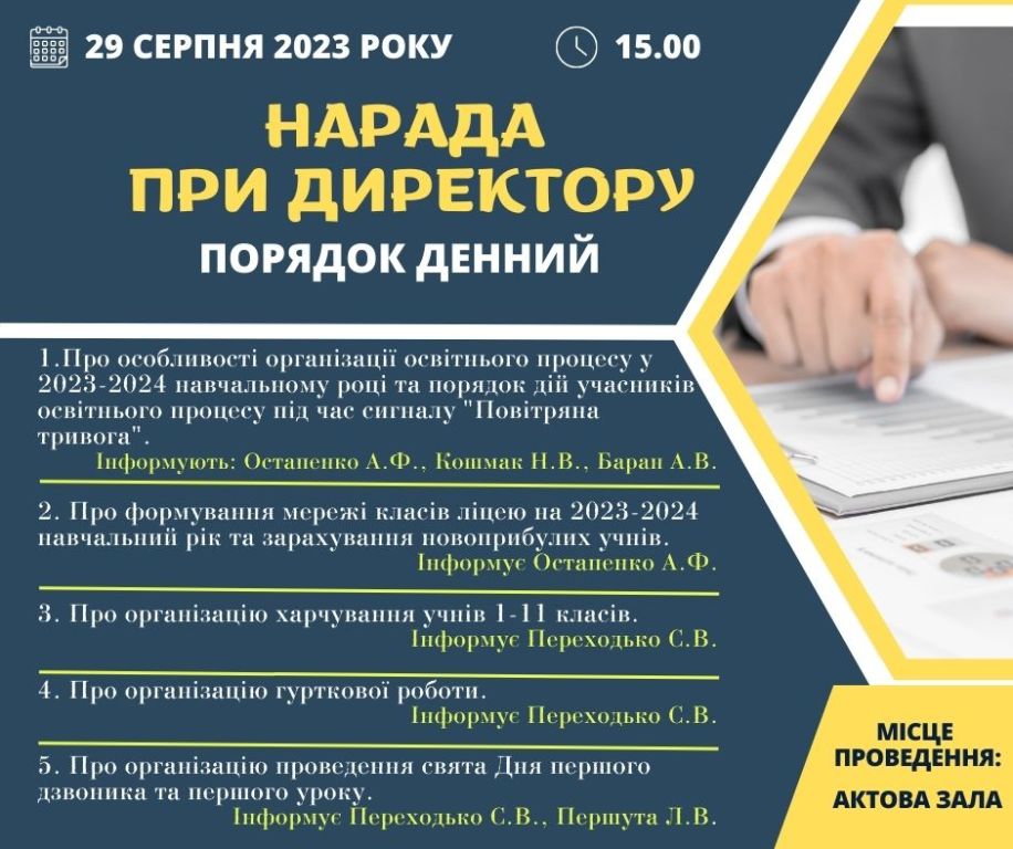 в актовій залі Володимирецького ліцею відбулося засідання педагогічної ради, на якому директором закладу А.Ф. Остапенком було підведено підсумки роботи за 2022-2023 н.р., визначено пріоритетні завдання колективу на 2023-2024 навчальний рік, схвалено освітню програму, план роботи на 2023-2024 н.р., розглянуто коло питань щодо організації освітнього процесу в умовах воєнного стану.