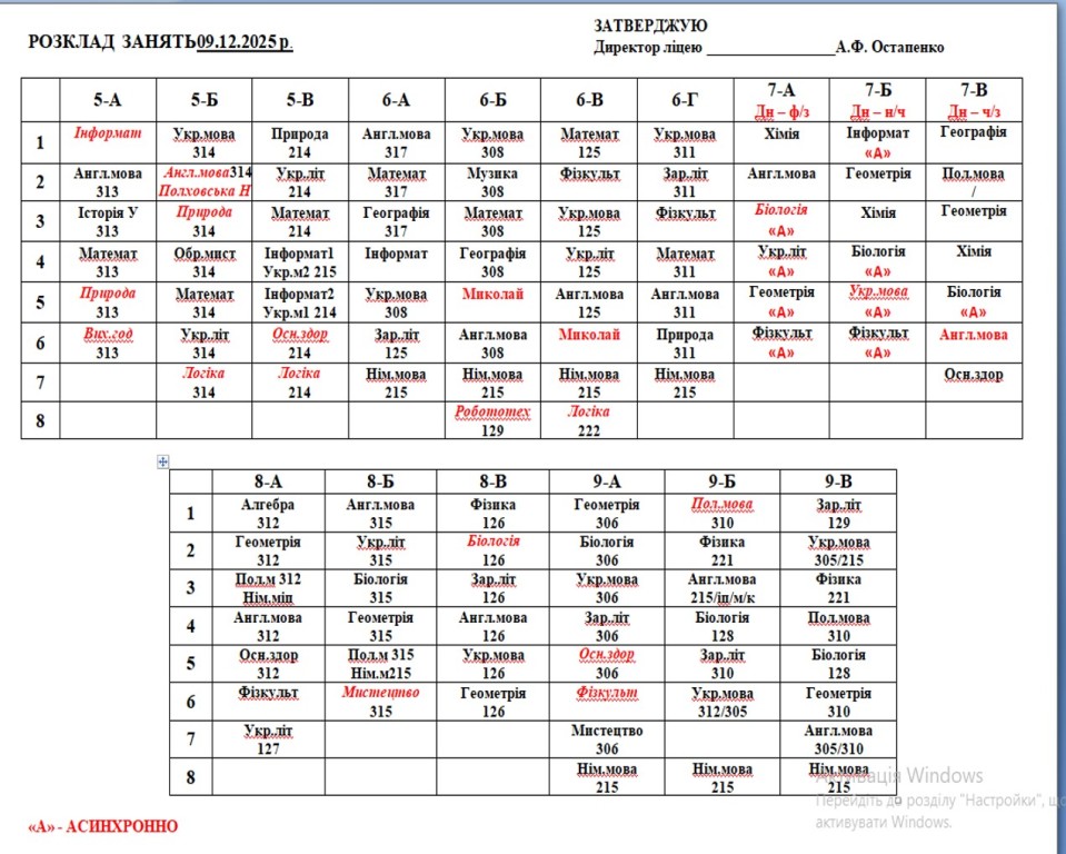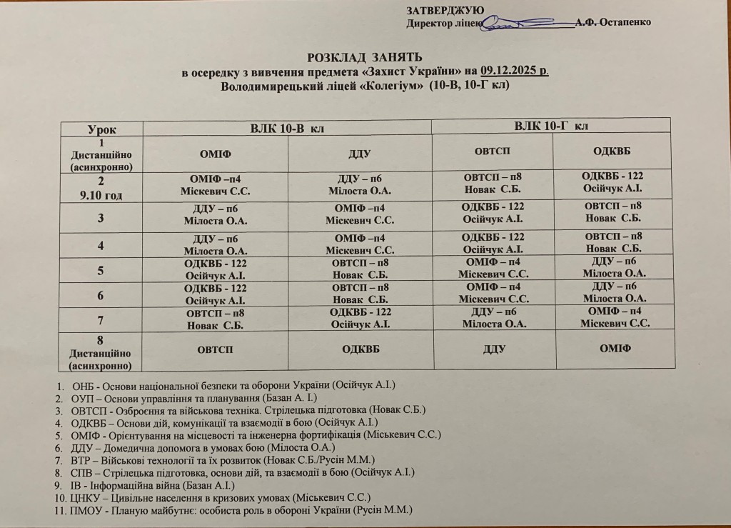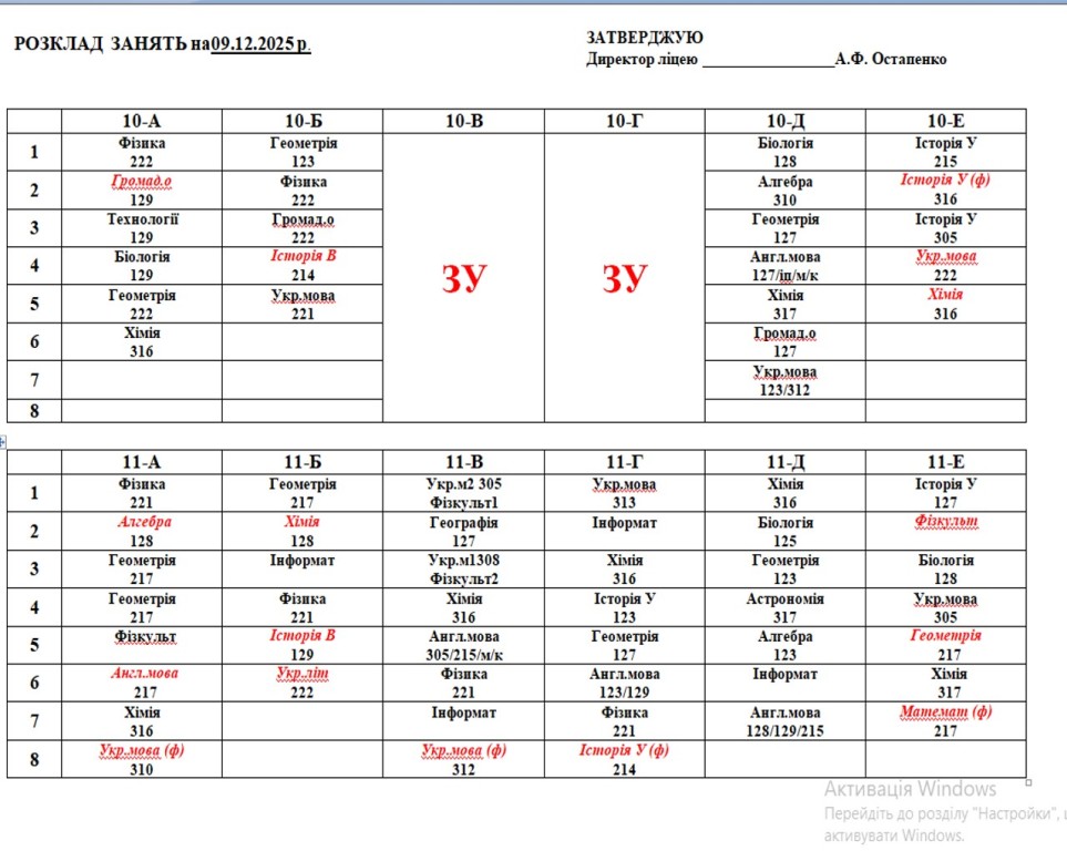 Розклад навчальних занять на 09.12.25