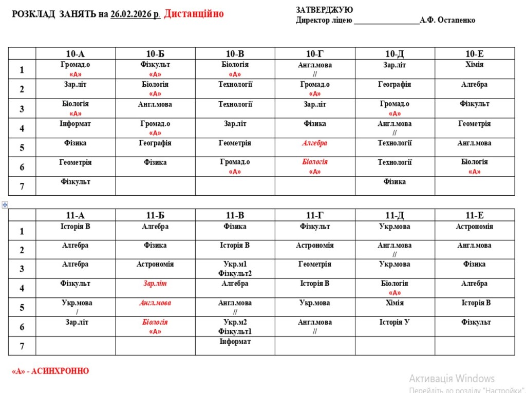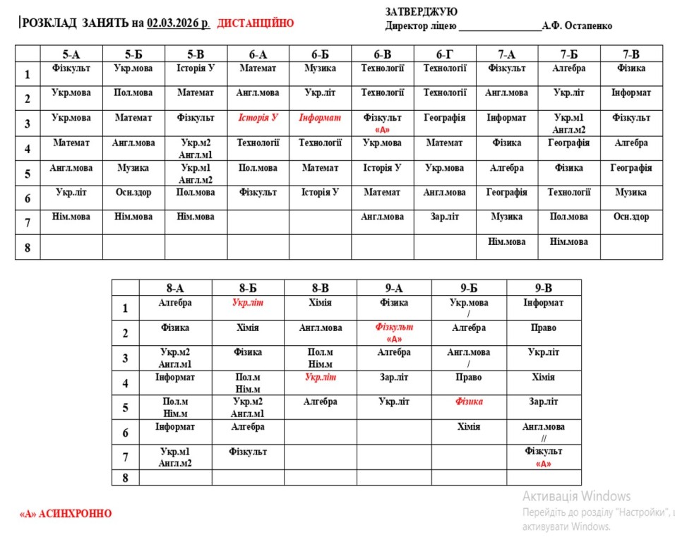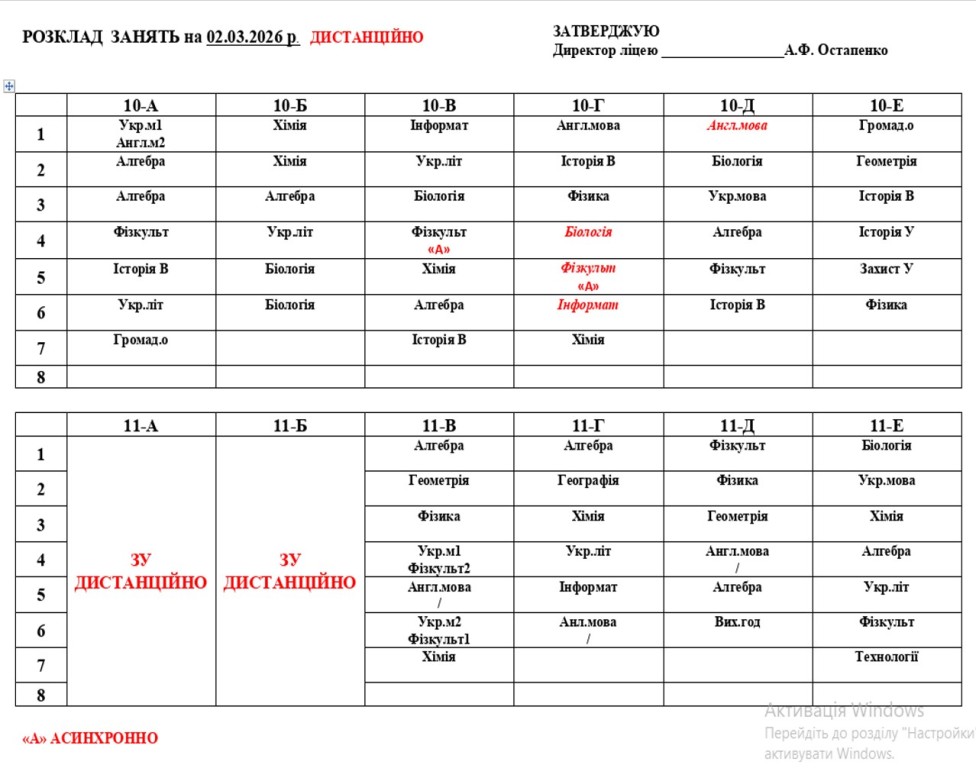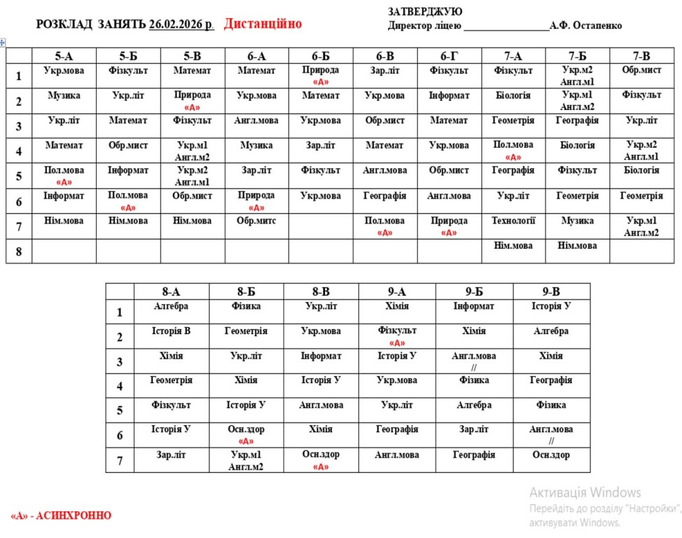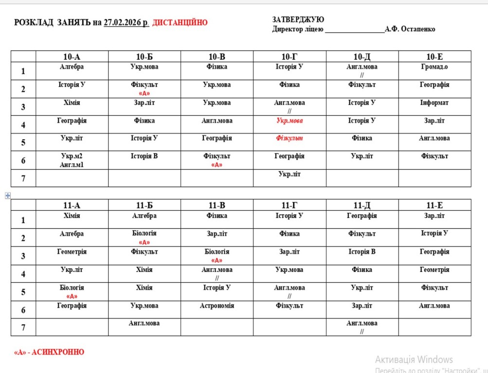 Уроки проходитимуть онлайн відповідно до чинного розкладу на платформі дистанційного навчання ліцею. Просимо учнів своєчасно долучатися до занять та відповідально виконувати навчальні завдання.