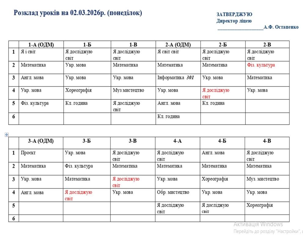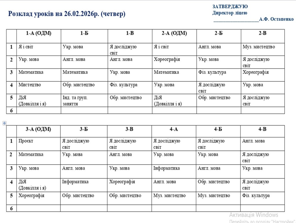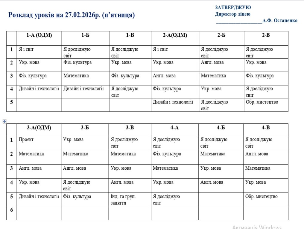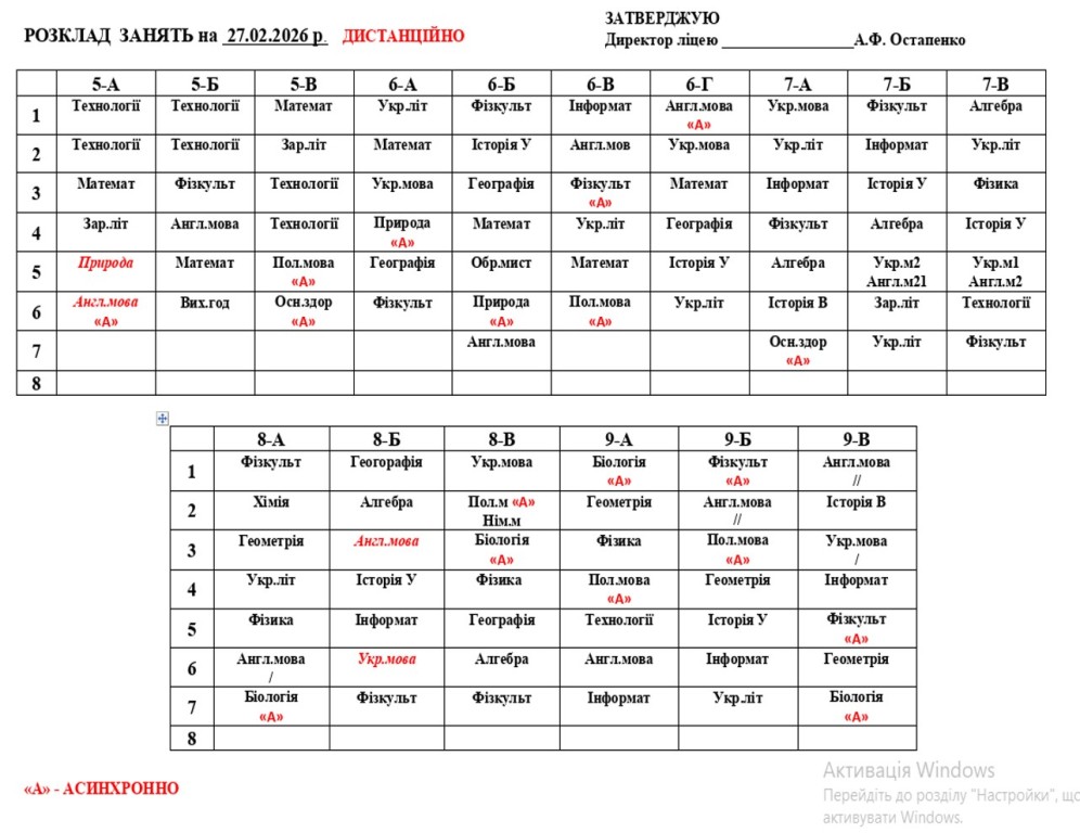 Уроки проходитимуть онлайн відповідно до чинного розкладу на платформі дистанційного навчання ліцею. Просимо учнів своєчасно долучатися до занять та відповідально виконувати навчальні завдання.