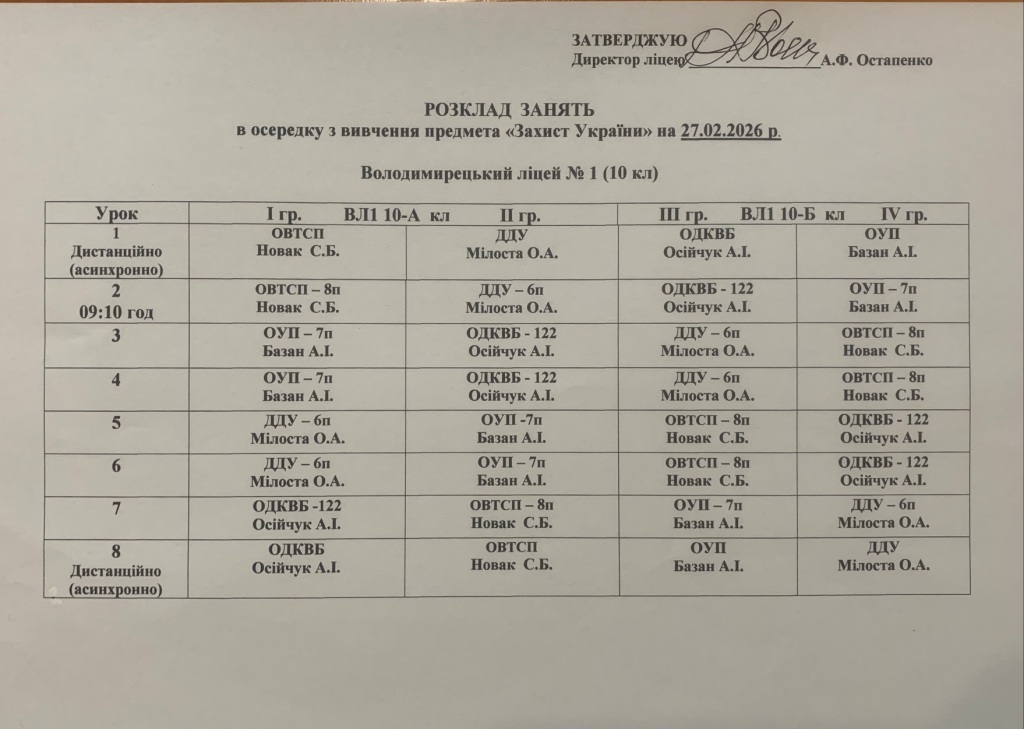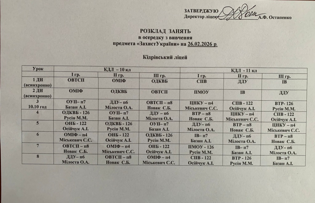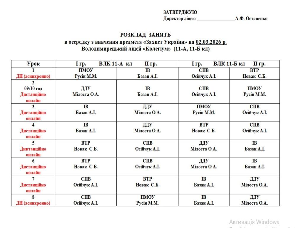 учасників освітнього процесу на ГРВІ - 27%, 02 березня 2026 року освітній процес у ліцеї буде організовано в дистанційному форматі відповідно до розкладу занять.