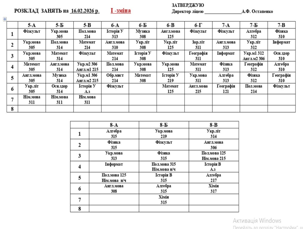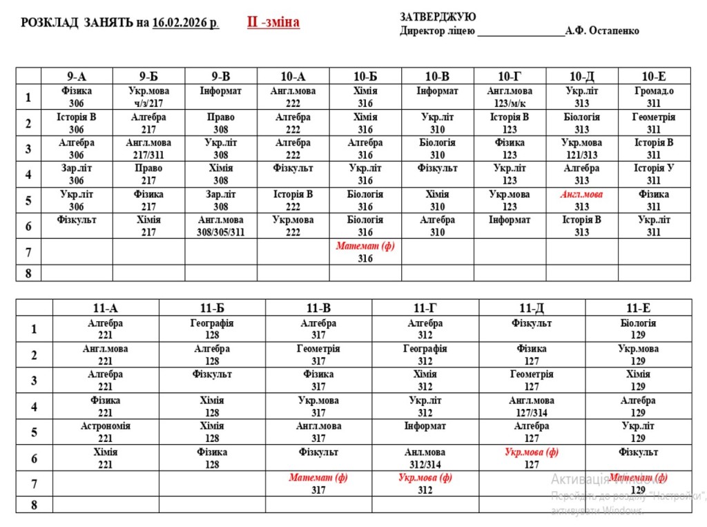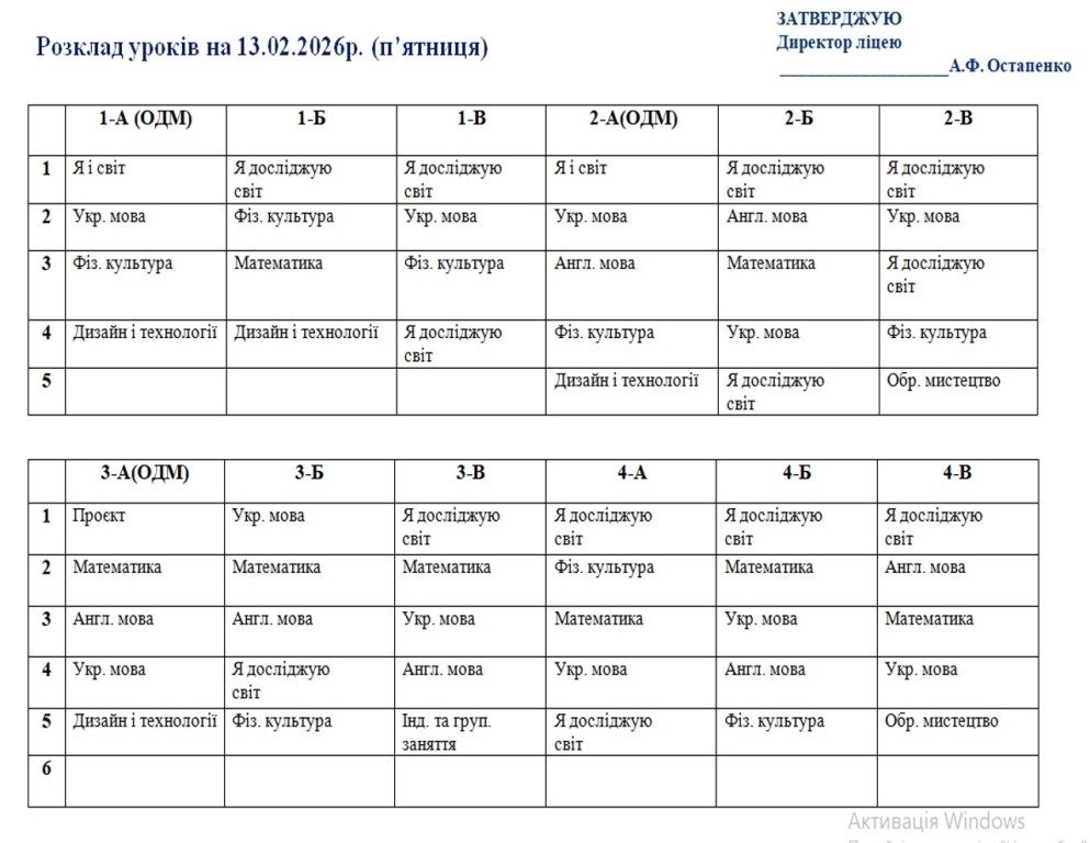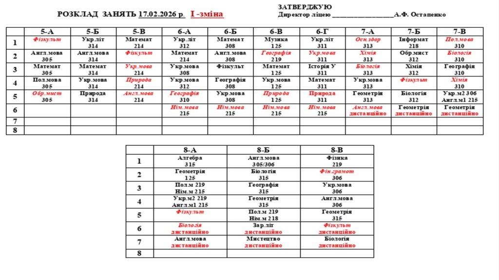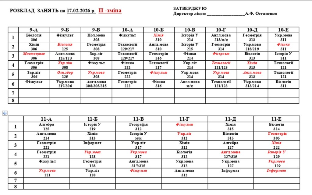 Повідомляємо, що з 16 лютого 2026 року освітній процес у ліцеї відновлюється в очному форматі. У зв’язку з необхідністю забезпечення комфортного температурного режиму та з урахуванням енергетичної ситуації навчання буде організовано у дві зміни відповідно до затвердженого розкладу занять та оновленого розкладу дзвінків.