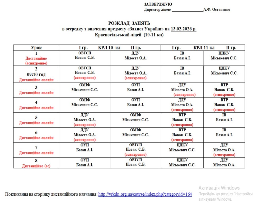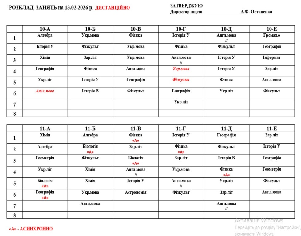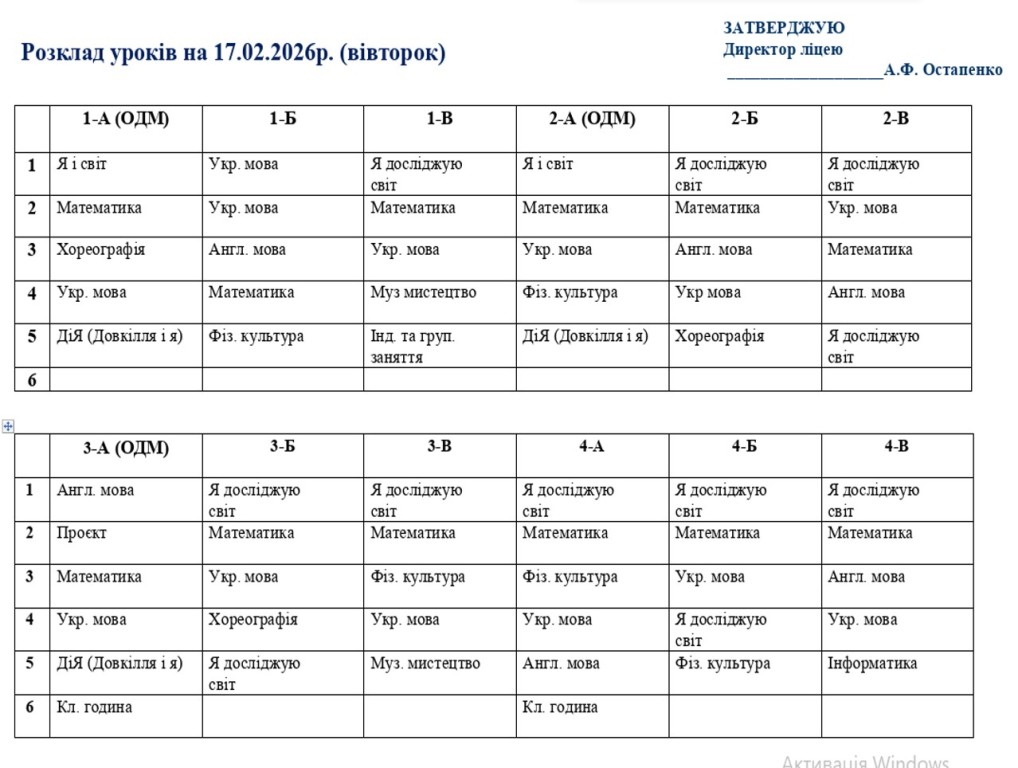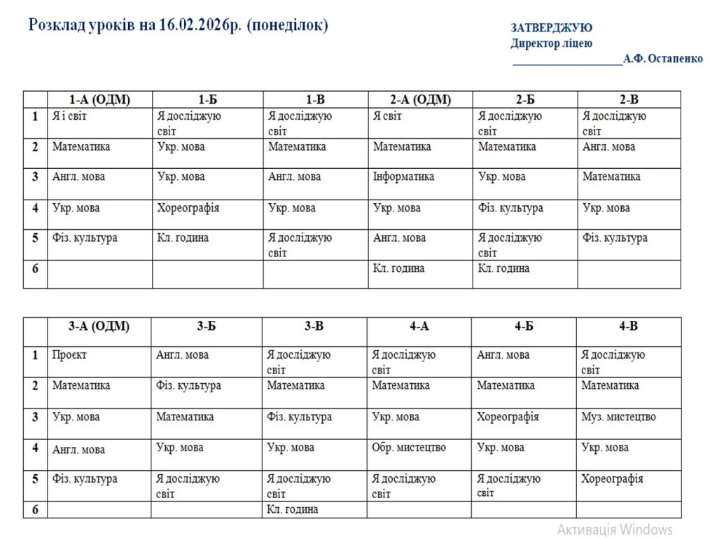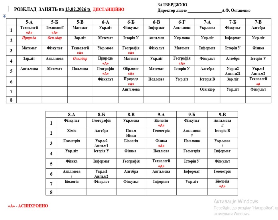 Повідомляємо, що з 16 лютого 2026 року освітній процес у ліцеї відновлюється в очному форматі. У зв’язку з необхідністю забезпечення комфортного температурного режиму та з урахуванням енергетичної ситуації навчання буде організовано у дві зміни відповідно до затвердженого розкладу занять та оновленого розкладу дзвінків.