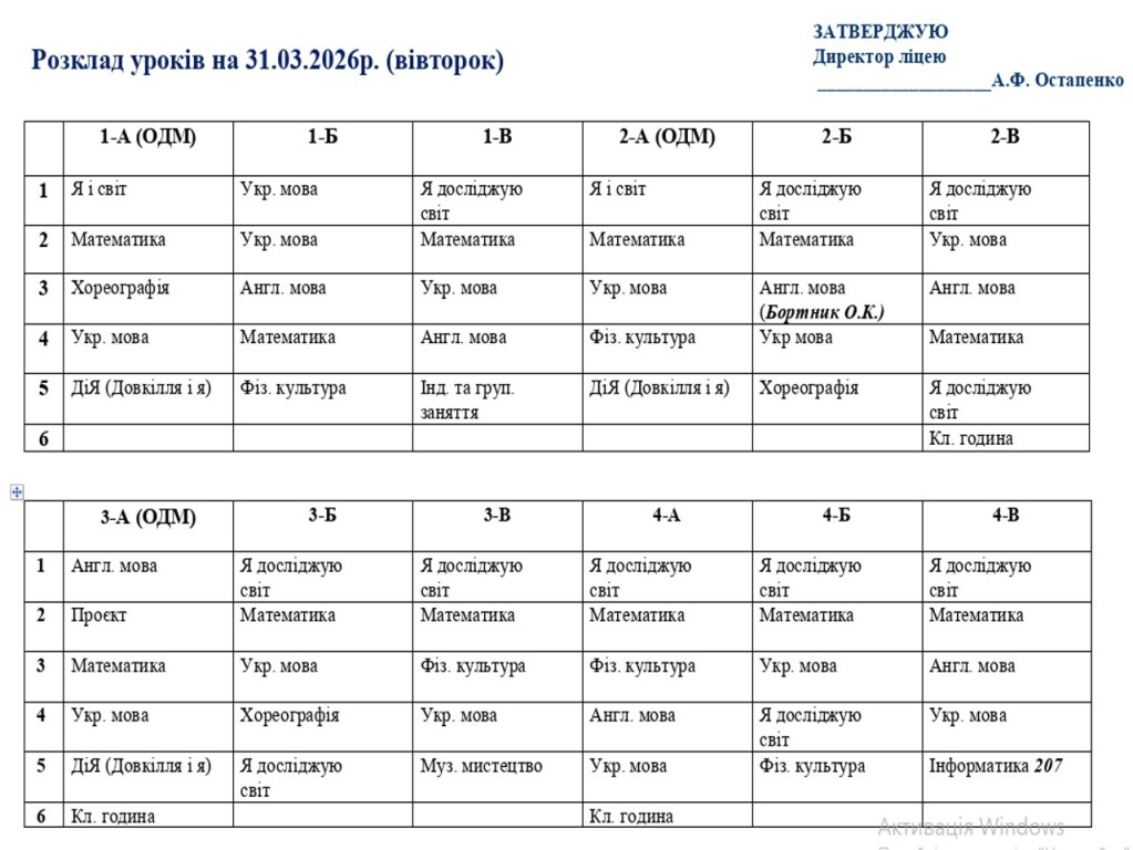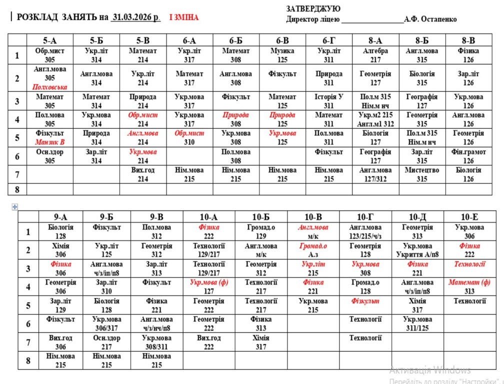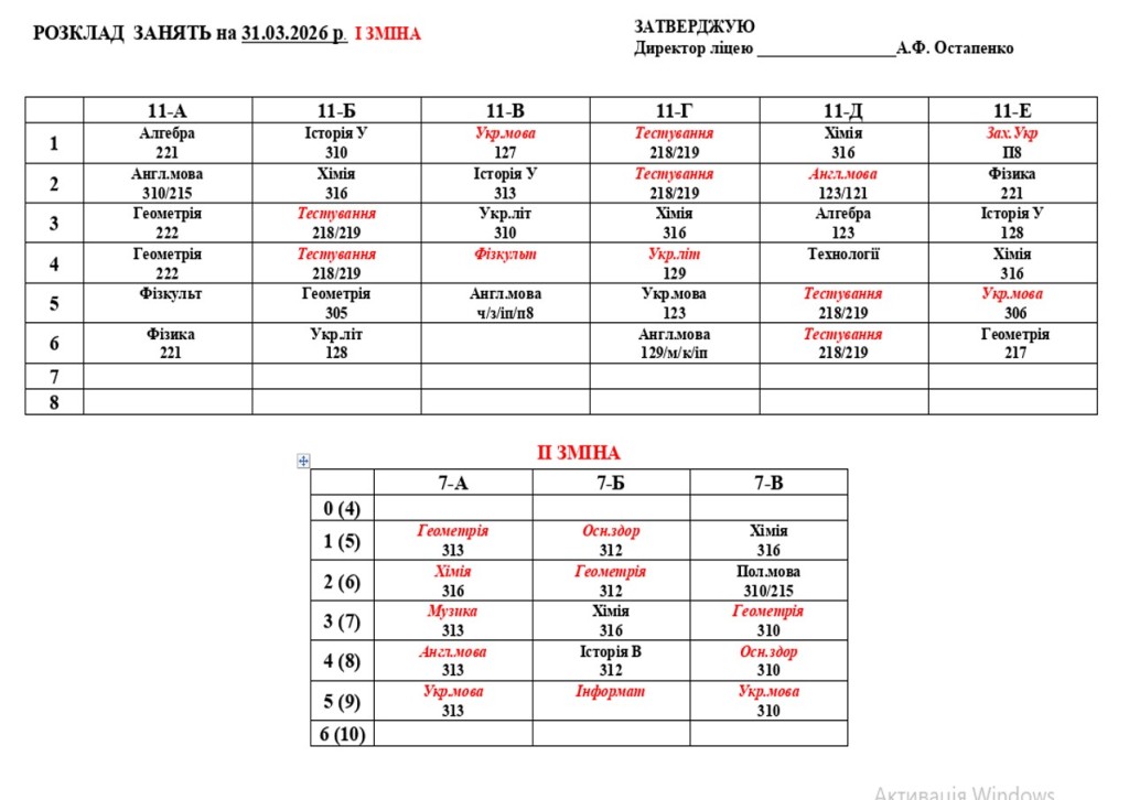 Розклад навчальних занять на 31.03.2026 року
