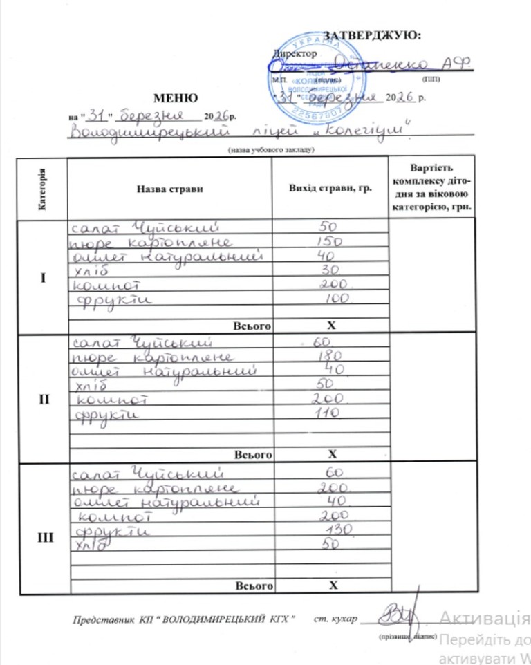 Меню на 31.03.2026 року