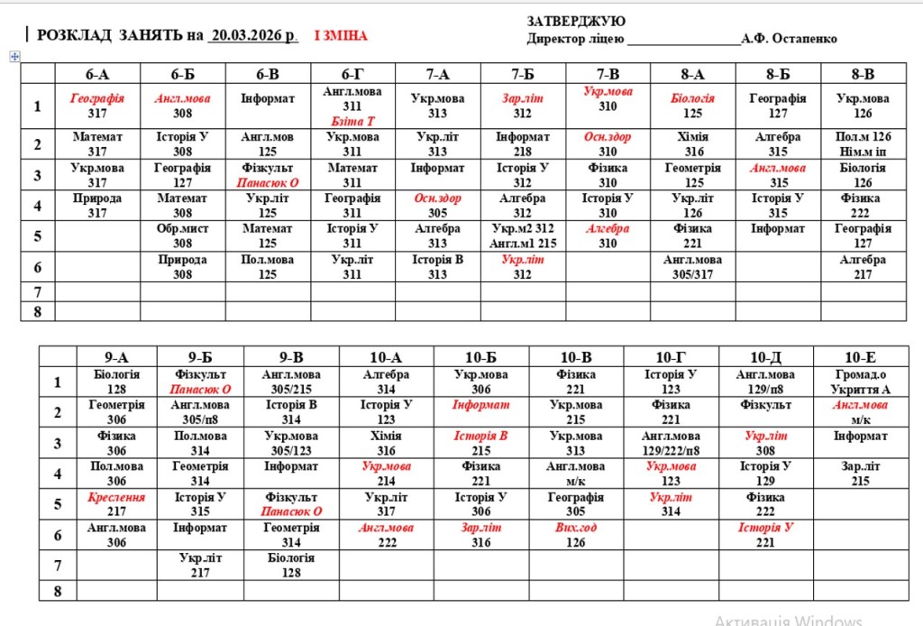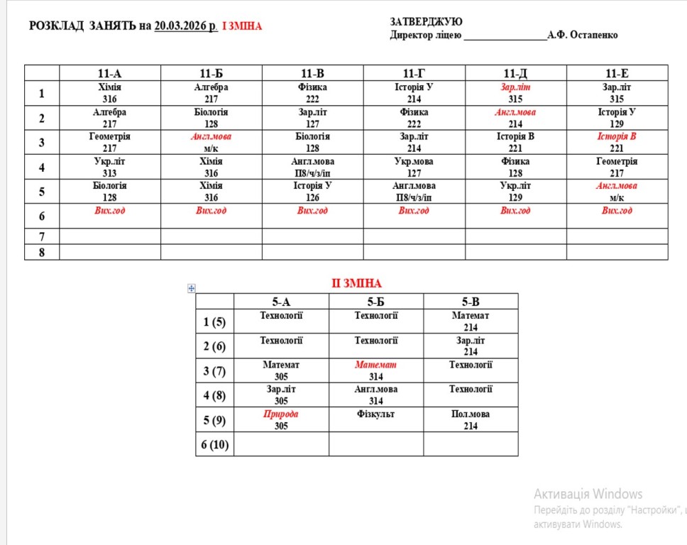Розклад навчальних занять на 20.03.2026