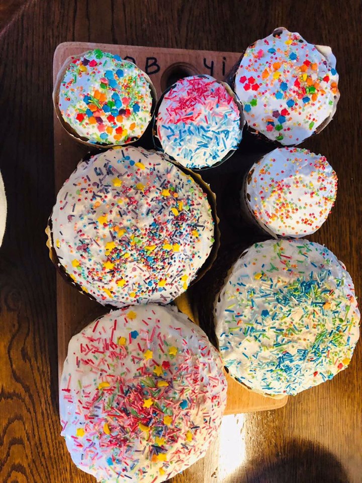 4. Приготувати глазур, пофарбувавши в різні кольори. Змастити верх паски білою глазур’ю і посипати конфітюром харчовим. Можна написати в центрі ХВ і зробити будь-який малюнок. Також можна залити паску шоколадною глазур’ю.