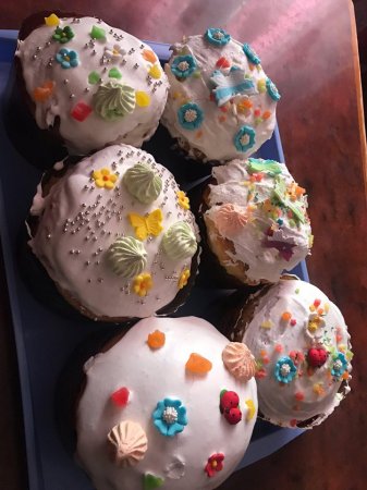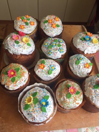 Інгредієнти:– 2 яйця;– 3 жовтка ;– 350 грамів цукру;– 1/2 склянки цукру;– 90 грамів масла вершкового;– 1/2 склянки рослинної олії;– 50 грамів сметани;– 2 склянки молока;– 100 грамів свіжих дріжджів або 30 грамів сухих;– 700 грамів борошна;– 100 грамів родзинок;– 50 грамів цукатів;– 50 грамів горіхів;– 2 пакетики ванільного цукру;– сіль за смаком;Глазур:– 2 яйця (білок);– 140 грамів цукрової пудри;– лимонний сік і харчові барвники.