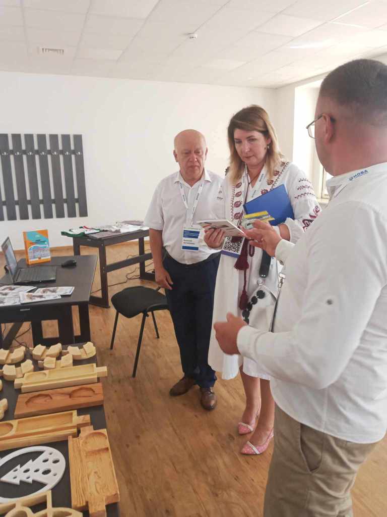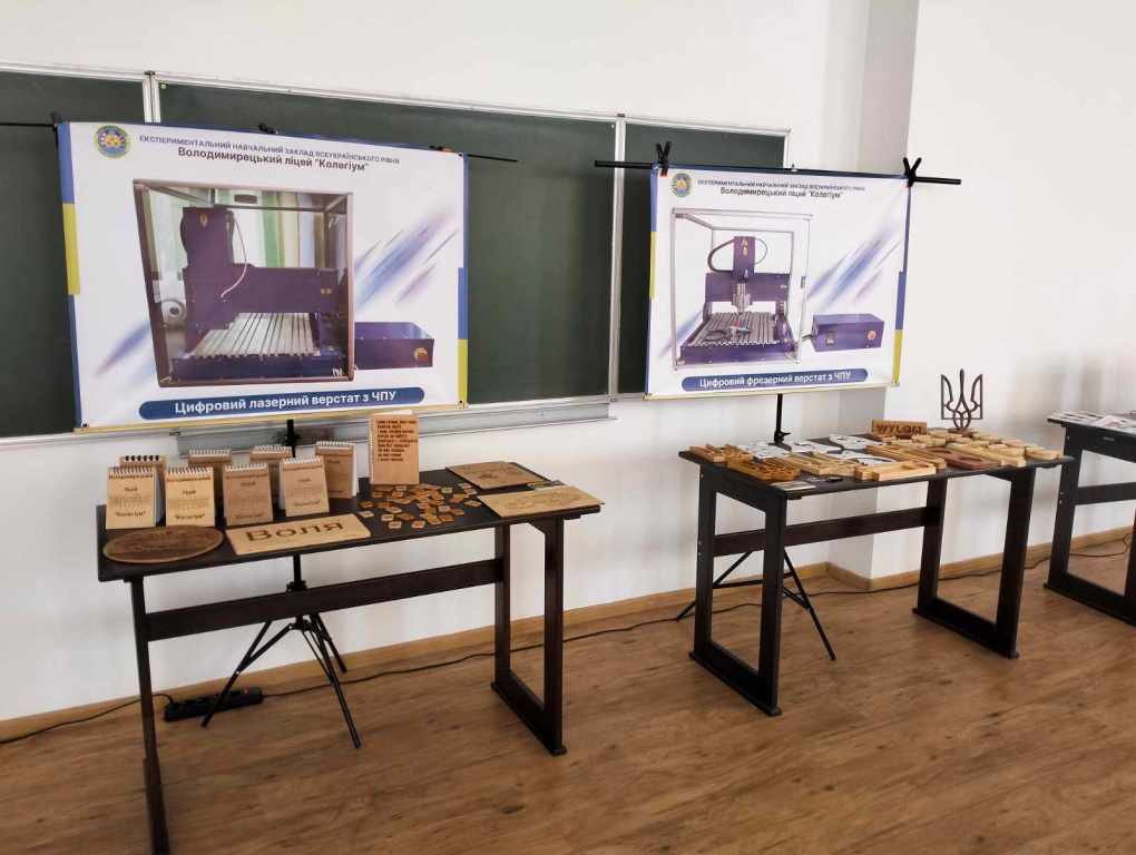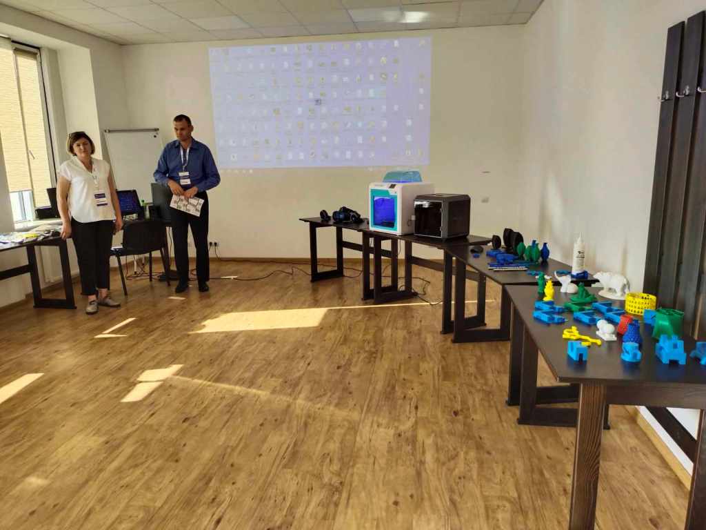 - Дуляницька Ірина, вчителька математики, Хомич Віталій, вчитель технологій, та Мілоста Оксана, вчителька інформатики, - в освітній майстерні «Інтегроване навчання на уроках технологій за допомогою цифрових верстатів з ЧПУ та вишивальної машини».