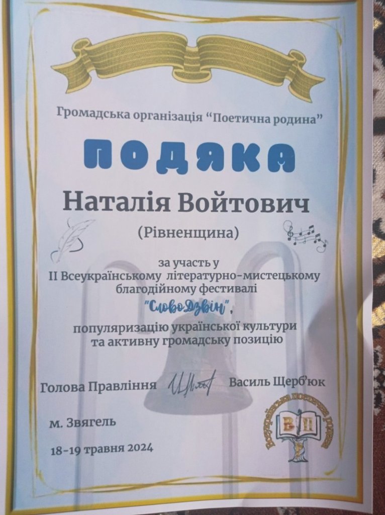 Два насичених дні запам'ятаються надовго: презентація нових книг, фестиваль мистецької майстерності, поетичне волонтерство, виставка- продаж книг і виробів, привезених авторами, для підтримки ЗСУ, а ще неофіційні зустрічі, спілкування, обмін творчістю - все це створило надзвичайну атмосферу. На заході побувала наша вчителька і поетка Наталія Войтович. Вона представляла Рівненщину.