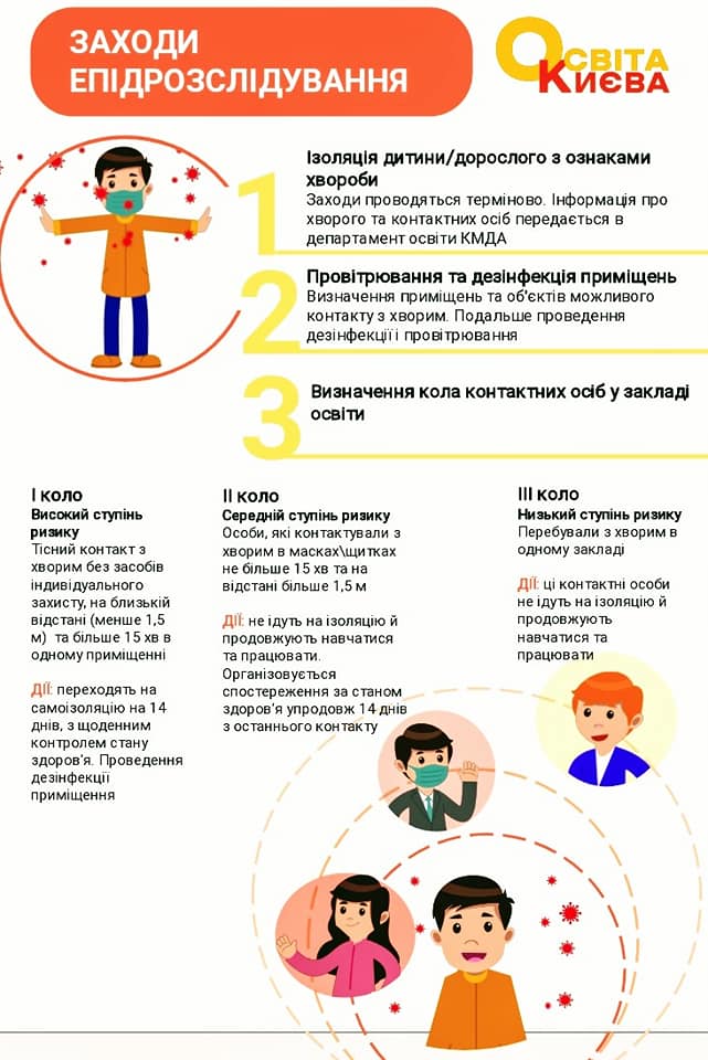 2 коло: середній ступінь ризику. Контактували з хворим в масках / щитках не більше 15 хвилин та на відстані 1,5 метра. Дії: спостереження за станом здоров’я впродовж 14 днів;