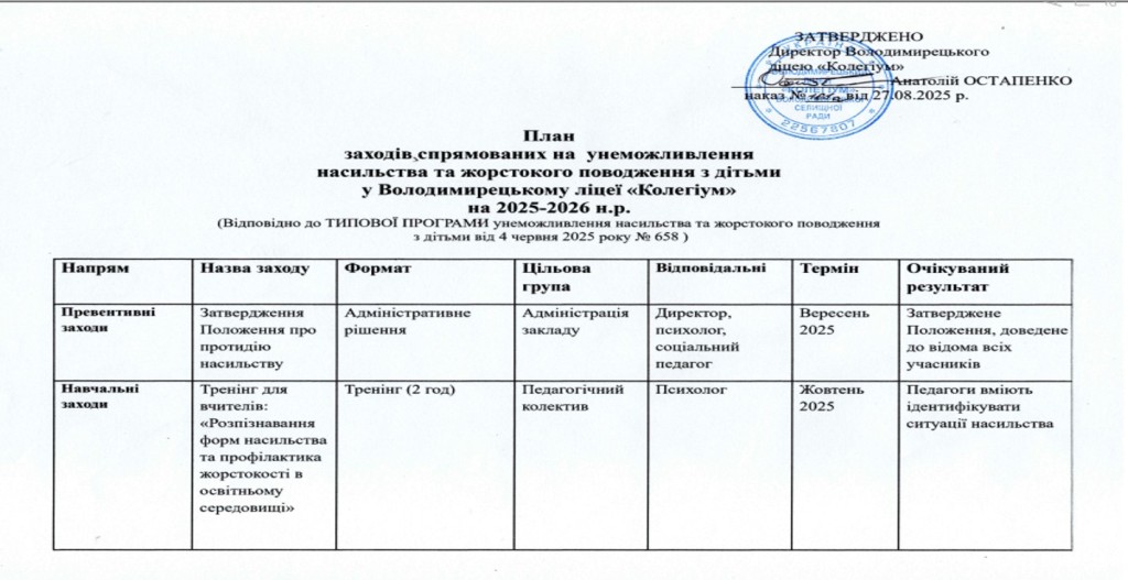План заходів, спрямованих на запобігання та протидію булінгу (цькуванню) в закладі освіти