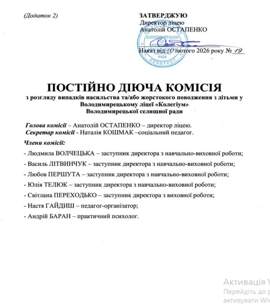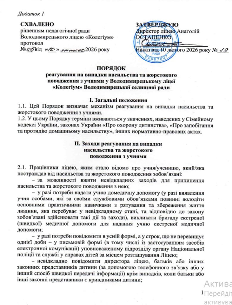 Положення щодо унеможливлення насильства та жорстокого поводження з дітьми у Володимирецькому ліцеї "Колегіум"