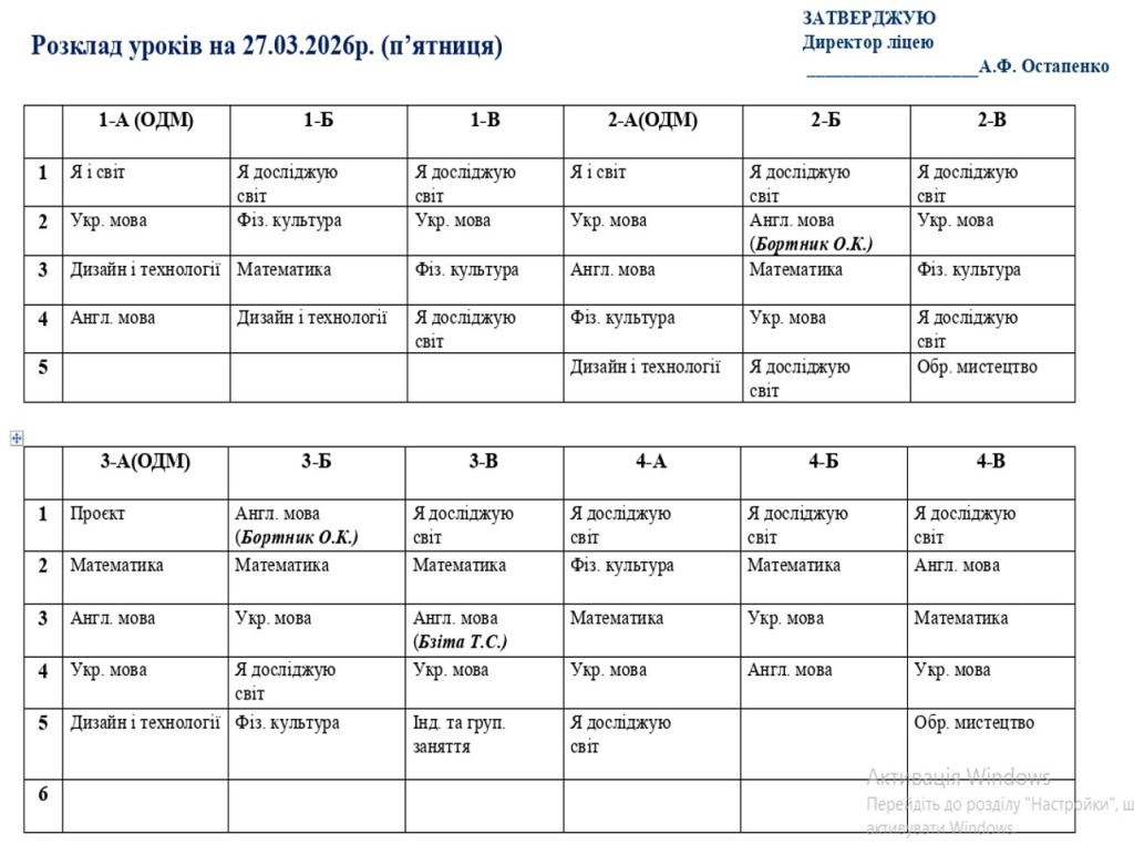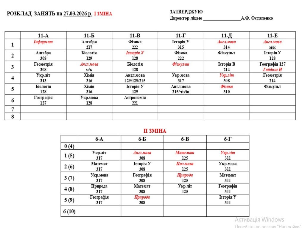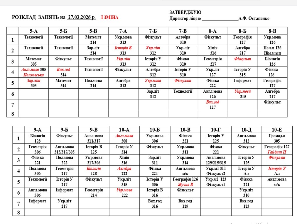 Розклад навчальних занять для учнів 1-11 класів на 27.03.2026 року